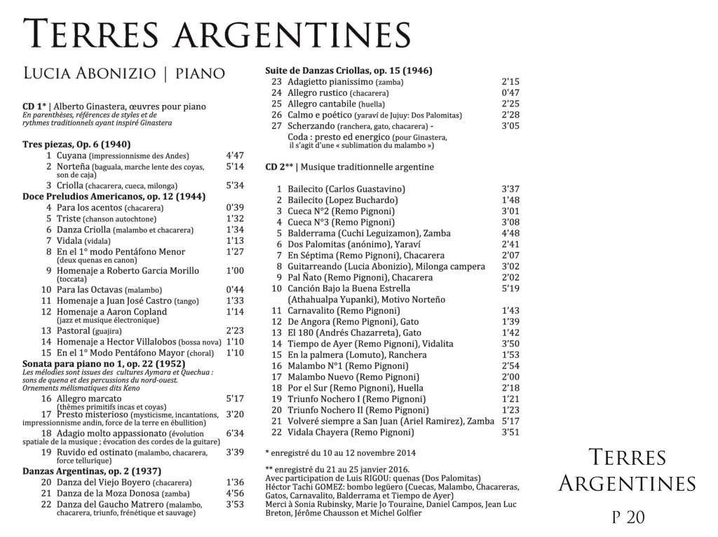 De sa part Lucia Abonizio rend hommage à Alberto Ginastera dans son Double Album « Terres argentines » édite par Klarthe sur la thématique : Alberto Ginastera et la musique traditionnelle argentine. Ce grand compositeur a consacré son talent à nourrir la construction d’une culture propre pour son pays. Il a tracé le chemin de nombreux musiciens jusqu’à nous jours.