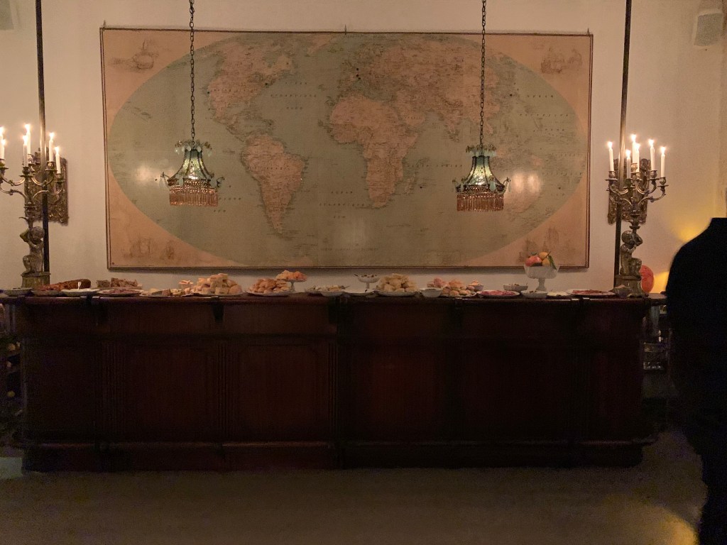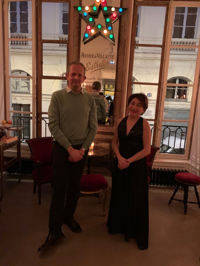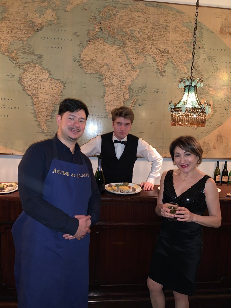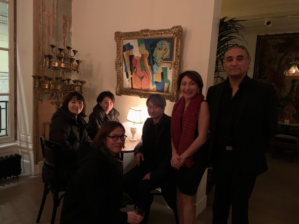 Gala evening at Astrid de Villatte in Paris. With Ivan Pericoli and Benoît Astier de Villatte in the presence of the Countess Balthus, wife and muse of the painter Balthus. Setsuko Klossowska by Rola who created a collection of aristo-bohemian ceramics produced for the Parisian house Astier de Villatte.