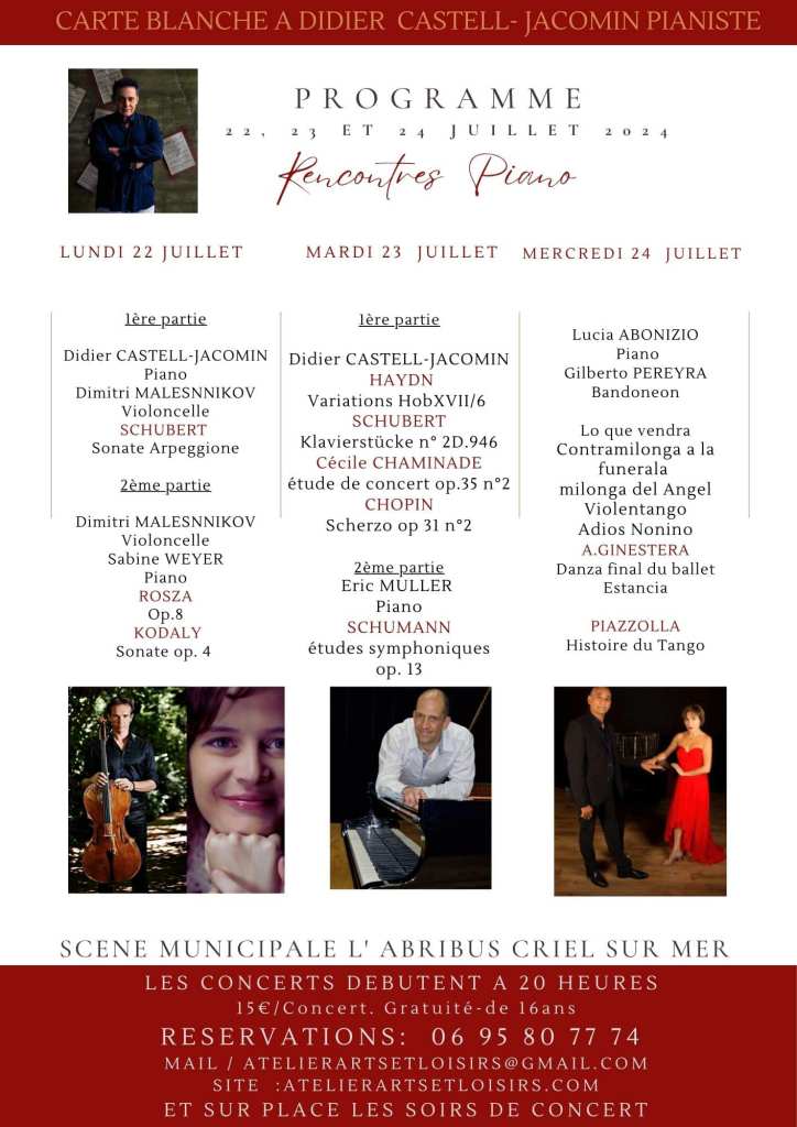 Samedi 26 Juin 2021 a 20h00: Clôture du stage avec un concert d’élèves suivi d’un récital du Duo SUD -Lucia ABONIZIO Piano – Gilberto PEREYRA Bandonéon. Salle Val Rhonne – Allée de l’Europe. 722230 Moncé en Belin.